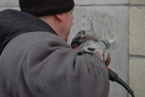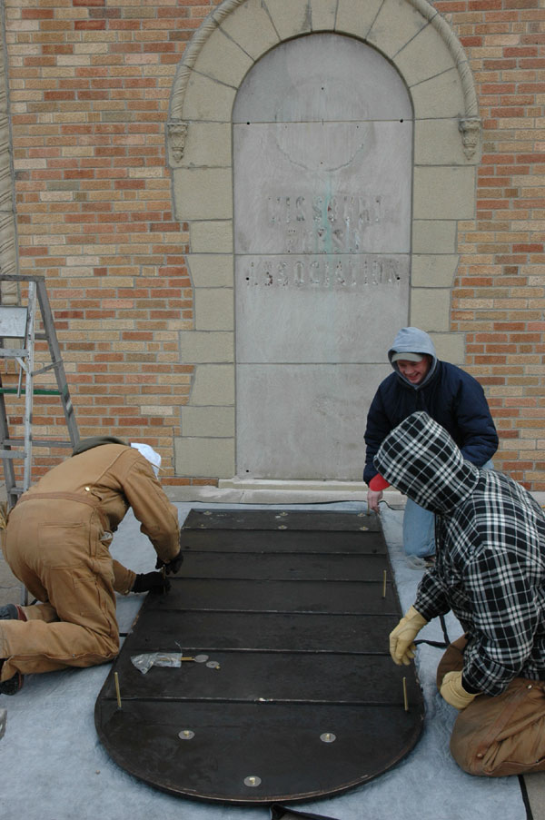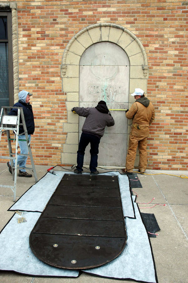 In the photos to the left, you will see Morris Shepherd and Justin Butler from the foundry actually installing the plaque with the help of two local sign company employees.