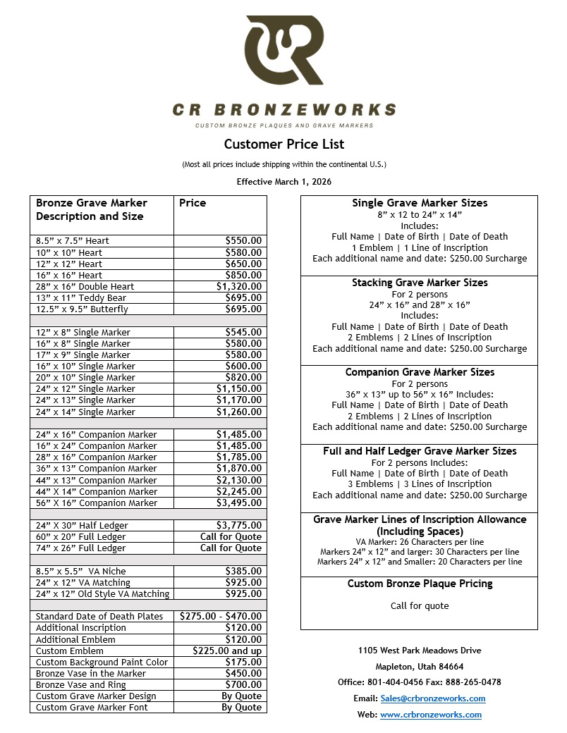 CR Bronzeworks Pricing for Bronze Markers & Accessories